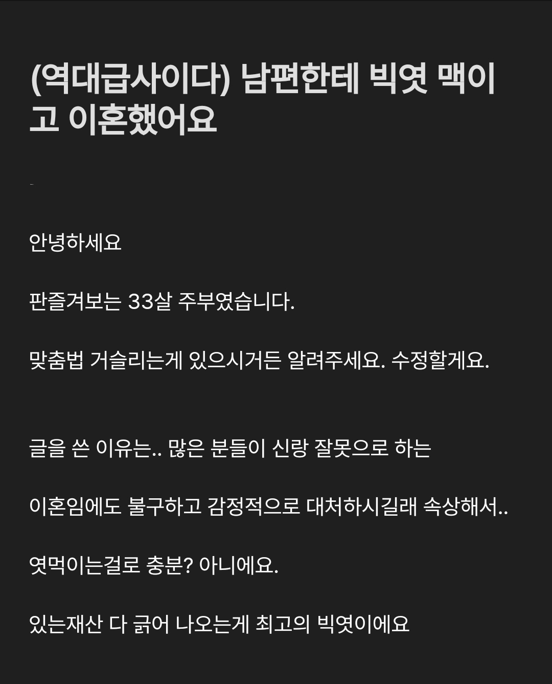 (역대급 사이다) 남편한테 빅 엿 먹이고 이혼한 썰