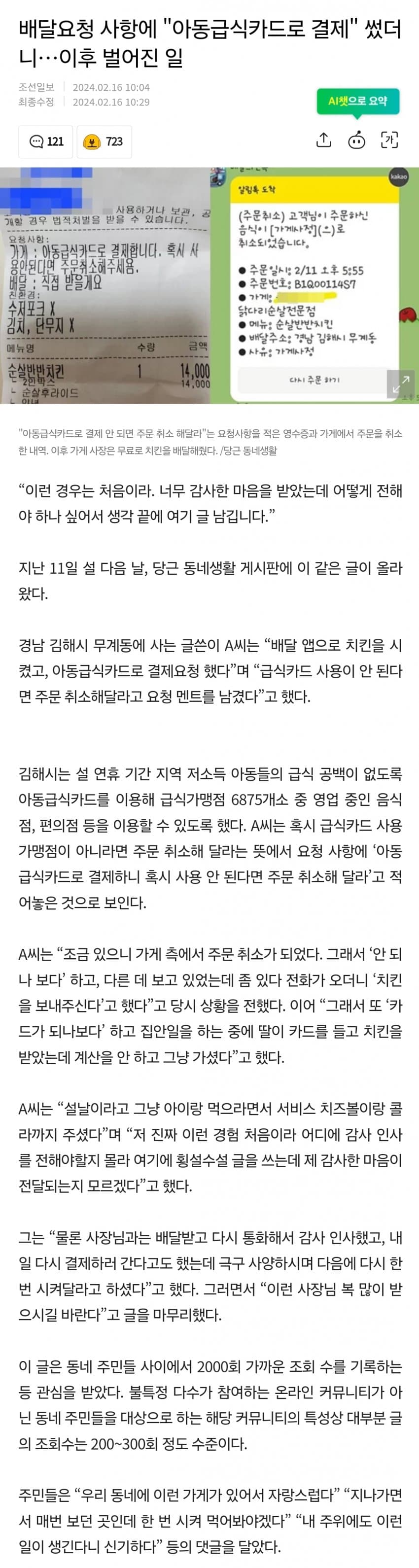 배달 요청 "아동급식카드로 결제할게요" 주문 취소한 사장님 그런데